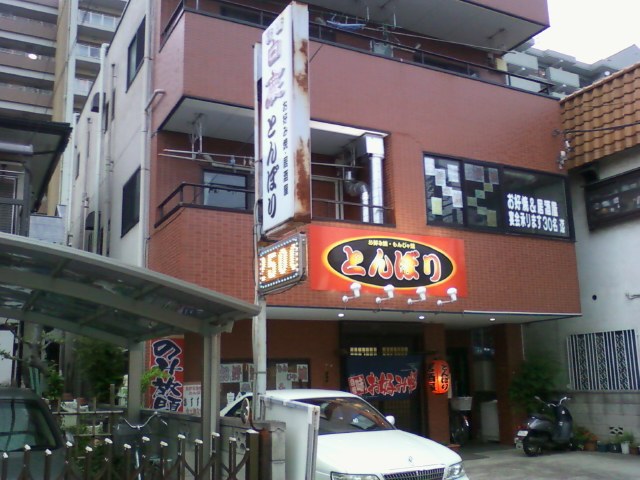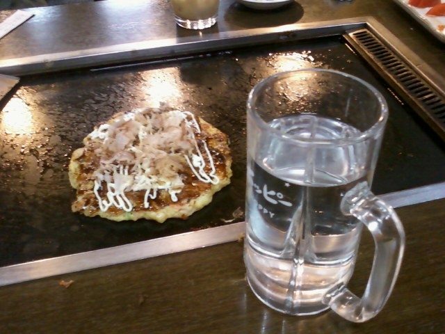 先回の旅で「サンザ」情報を貰いまくった、影のガイドK氏と報告会(って、毎度の飲み会なんだけど…)。食べ損ねた「お好み焼き」を腹いっぱい食するため、選んだお店が宮原の「とんぼり」。食べ飲み放題3時間が¥2800という格安価格(ビール含む)。大食漢2名でお好み焼きを5枚とサラダ等、単品料理を食べた他、筆者はビール3杯と写真のジョッキ芋焼酎/お湯割り2杯で撃沈しやした。で、ナニ報告したんだっけ…?