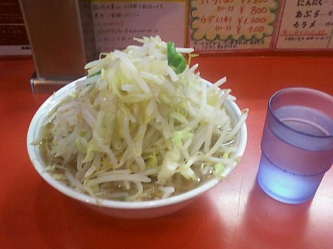 急に「二郎」系が食べたくなった…。と言っても「陸」は遠いので、どこか県内にないか検索してみると、川口に良さげな店が見つかる。ちょうどアキバで買いたい物が有ったんで…。開店時間の少し前に到着すると、さすが連休最終日、既にジャスト30人並んでるぞっ。まぁ、それだけ人気が有って「旨い」って事なんだろうからイイや。並んでいる段階で、注文は確認され、待つこと約30分、席に着くとすぐにトッピングを聞かれ、定番「野菜増し」を伝えると、程なく「モヤシの山」が目の前に…。コレで「ミニ(¥630)」なんだけど、多分カロリーは普通のラーメン以上。腹は膨れる。