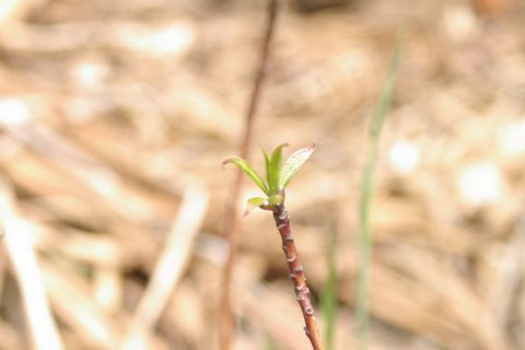昨年、福井県山奥の崖崩れ現場から「引っこ抜いて」きた、名も知らない低木(ピンクの小さな花が咲いてた)。一度は、「雑草」と間違われて、家のモンに「日干し」にされ、葉っぱが全部枯れたのを、慌てて筆者に埋め戻された経緯あり(笑)。それが、暖かくなって、枝の先っぽに葉が出てきた。やっぱ「強い」ワ。アブラムシに取り付かれてるけど、花まで咲くかなぁ? 気候が違うからドウなんだろ。