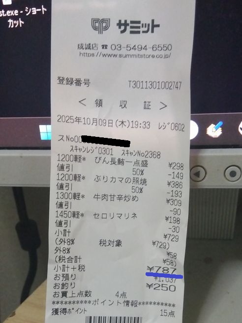 別に狙っているわけでも、暗算してるワケでもないのだが、だいたいこの位の額で収まるというハナシだな…。今回も「牛肉と玉ねぎの甘辛だれ炒め」を買っているのは、いつも見切られているからだろう。