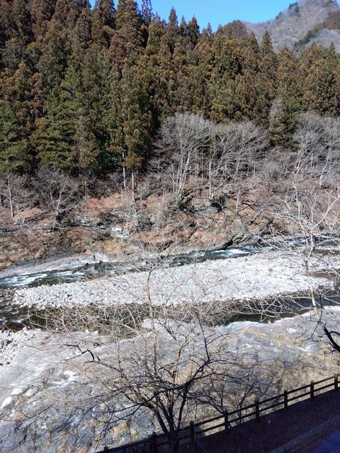 月に一度、土曜日出勤がある関係で平日の日帰り温泉。秩父の道の駅併設温泉に向かう。料金は平日750円、休日800円だった。階段を降り「岩風呂」と称された内風呂へ向かと、タイル張りではあるが、ソレっぽい小さめの浴室。MAX10人といった規模で、休日の国道沿い道の駅では、間違えなく混雑が予想できる。平日の正午過ぎは、サウナに入っていた若者があがってしまうと、その後ずっと貸し切りだった。泉質は「辛い」くらいの海温泉。2-3日前の擦り傷が沁みる位で、目に少しばかり入ろうものなら、その塩度は推し量れるというもの。温まるのは確実で、この季節には最適かも…。窓からの景色は、荒川上流部の川べりと、対岸の木々といった風景だった(一番下の写真みたいな感じ)。