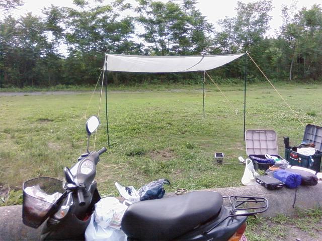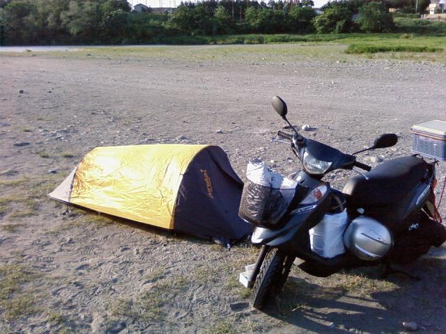 早速、旅人K氏の上京に合わせて(この人は失業保険の認定日に合わせて別府から毎月やって来る…)埼玉/群馬県境の烏川河川敷総合レクリエーション公園「角渕キャンプ場」にてお試しキャンプを実施した。集合場所は道の駅「おかべ」。正直、ツーリングキャンプの最低必需品が不明の為、持ってるモノを適当にアドレスに積載したらけっこうな量になってしまった。今回はココから不用品を見極めるのと、不足物品を洗い出すのが最大目的(?)。CD125というマニアックなバイクでやってきたK氏と15時前に現地へ着くと、トイレがあんまりキレイで無い他はそこそこのロケーション(とのこと)。明るいうちにテントを張った後(実家の庭で試行してたので15分ほど)、バイクで2キロ程離れたヨークマートに食材の買い出し。ビールと牛肉(800g)等を買い込みテントの側に戻ってくれば、直ぐにグリルの炭起こしを始める。その後の写真が一番上。炭の温度を上げとくのが少し面倒。網を持ち上げて、上から吹いて火力を上げてたけど、次までに炭入れの側面にドリルで穴をいくつか開けて、うちわで扇いだ方が良さげだった。あと、今回は牛肉を岩塩振り掛けて大量に食ってたけど、一人で行く時には「こてっちゃん」やレバーをチマチマ炙って、焼酎のお湯割りとかをチビチビ…、なコトになりそうな予感。まぁ、一人でもそこそこ出来そうな体験だった。
