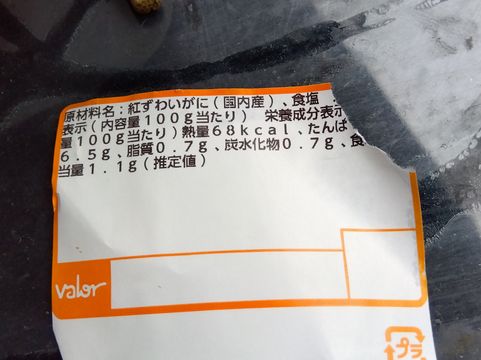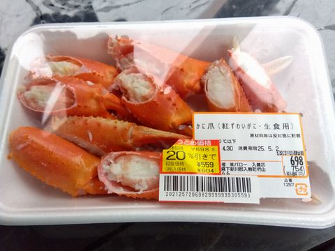 ハサミだけ詰められたパックが見切ってあって、つい買ってしまった。一応国内産となっているが、味は薄く、価格相応だ。食べ終えてから、殻の処分を想定していなくて途方に暮れる。