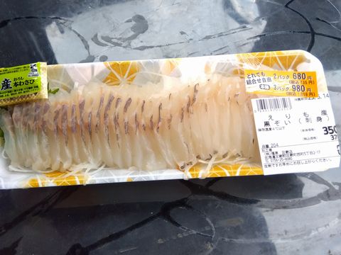留辺蘂のスーパーで売られていた「食べたことないヤツ」。身が薄いのか?、切り身も細長いのだが、「量」は十分。350円は安すぎる。味に関しては、コリっとした歯ごたえで、味は淡白。醤油持ってないので、ワサビだけで食べていたのだが、最後の方は何か「味変」して食べたかった。