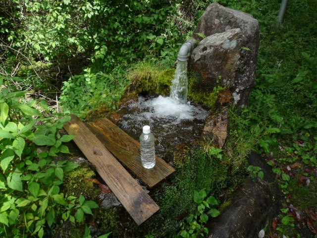 大分の山奥で10キロ程度の林道を走っていたら、水が滔々と流れてた。周囲に電柱など無く、ポンプではないみたいだ…。後ろに回っても、どこから引いているのかさえ判らん。だいたい、全く人けの無いこの場所で、なぜ流れている? とりあえず、お湯割り用に汲ませてもらった。