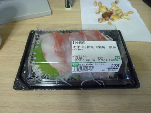 西友某店でしばしば販売されている鰹タタキの「切れっ端」と、サミット某店で売られていたブリの「切れっ端」(普通のは8切れだったんだけど、20ケ位入ってて同価格)。酒のアテには程よい歯ごたえでかなり合う。しかもお安いのが何より。