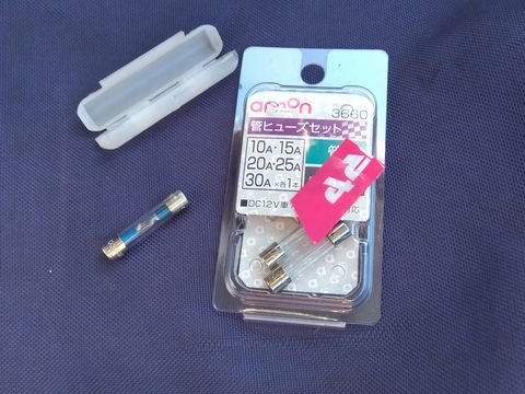 で、今回なぜかインバータが動かなくなった(毎度のトラブル)。試しに、別のインバータに接続しなおしてもダメだったので、直結配線を確認したところ、それに使っていた15Aのガラスヒューズが溶けてた(トホホ)。仕方なくホームセンターで購入して交換。使えるようになったのだが、15Aは使用している配線(赤黒のスピーカーケーブルみたいの)に合わせて設定したモノ。この15Aは家庭用電源100vを想定したモノか? バッテリーの12vでも一緒なのか? 工事屋の資格とか持ってないのでワカラン為になんとも言えん。
