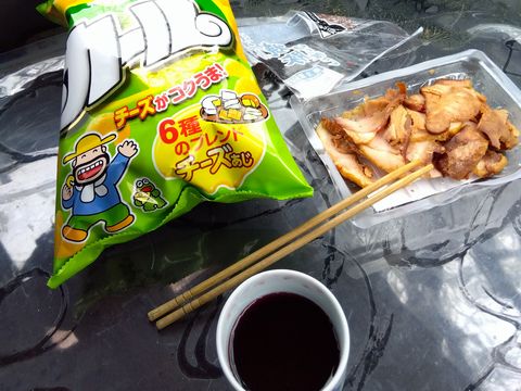 遠征中にも赤が呑みたくなるのだが、アテが難しかったりする。基本、洋風の惣菜がスーパーに少ないのと、ワイン自体が、田舎のスーパーでは入手しにくいのが原因。国産の甘いのと、ちょっと頑張っちゃった「お高め」のヤツとか…。そんな中でチリ産のペットボトルが、味とゴミ処理のしやすさで重宝している。ちなみに、この日のアテは、チャーシューとカール(チーズがけ)だ(毎度のことだが…、これだけだと飢えるので、刺身とフライをビールで食べた後の図だ)。