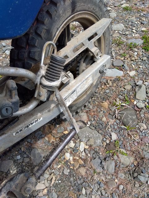 ココ一年で2度目の紛失。元々舗装路走るためのバイクを強引にオフロード仕様にしてるんで、スタンドとかステップとかの位置が低すぎるのが原因。草とか小枝に引っかかって、どこかへ飛んで行ってしまう。エンジンが止まるので気が付くのだが、探しに戻っても見つかった験しがない。ホームセンターで入手出来ているのでなんとかなるが、要は飛んでいかなきゃいいだろうと、手元にあった物品で考えた。