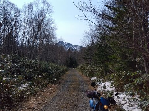 次に折川に沿った林道に進む。4匹も細長い生物に出くわした林道は、5キロほど先の砂防ダム近辺で終了。戻りも嫌だったのだが、残ってたのは1匹だけだった。次の大平川に沿った道は、2キロほどで工事現場を通過直後にゲートに阻まれて撤退。そして本命の泊川沿い林道。旅人K氏の情報で、上流に「泊川河鹿の湯」という野湯が存在するらしく、ソコを目指して進む。丁度幸運にも、冬季通行止めゲートを解放する作業現場に出くわし、作業員さんに大体の場所(トンネル出たトコから徒歩)を教えてもらうが、その場に着いても何の案内も無い。ツーリングマップルでは川の対岸とあるのでそちらを確認するが、場所の前に、川の水量が雪解け水でハンパない。渡河できないので、周囲の写真を撮っだけで、諦めて帰ってきた。その日、K氏に確認したところ、場所は合ってたみたいなので、いずれ再来予定。ついでの情報として、近年お湯が枯れかけているらしく、小さい穴で「足湯」だけの可能性も指摘される。