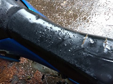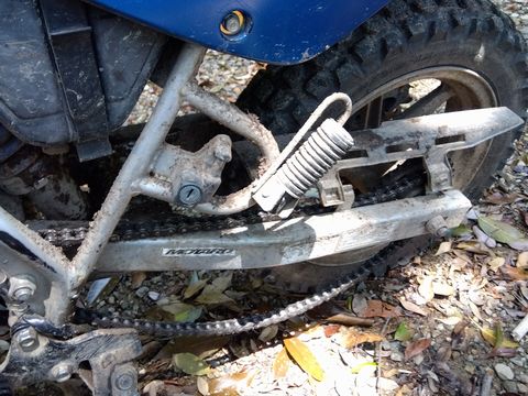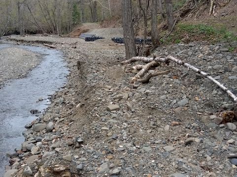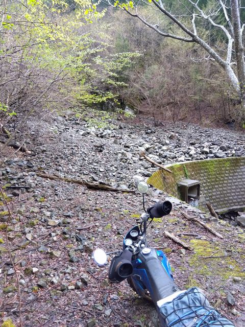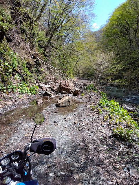バイクを降りて確認すると…、河原に下りての進路は有る。事実、バイクタイヤの跡が見て取れたのだが、よく見ると、同じ太さのバイク走行痕がもう一本。推測するに、ココを強引に通過した誰かさんは、この先で「更なる」困難に直面し、引き返してきたと…。まあさきは自重し、Uターン。