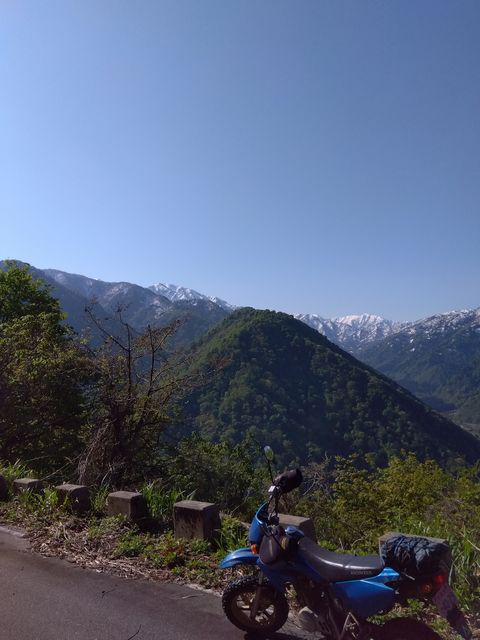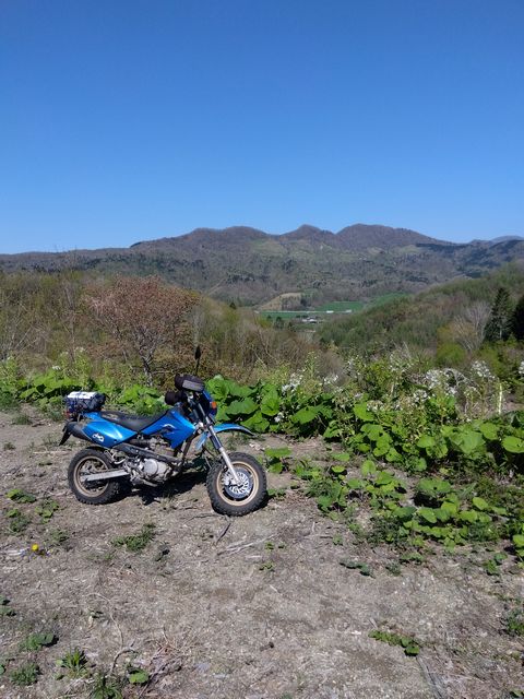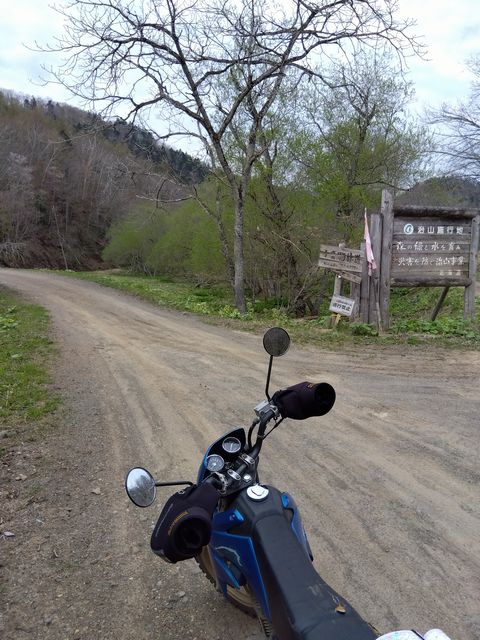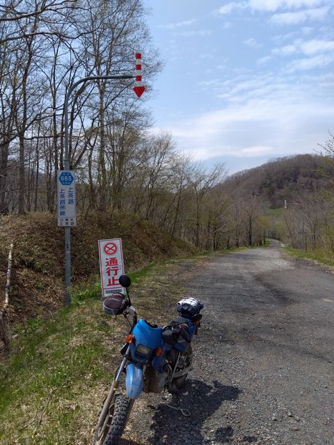 白音林道を走り切り、道道665号のダートへ進む。途中に存在した、崩れかけた廃墟と桜の木が、キビシイ北の大地を象徴している。国道392号まで到達し、元の道を戻った。