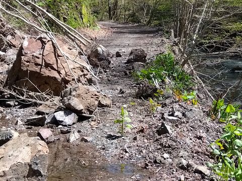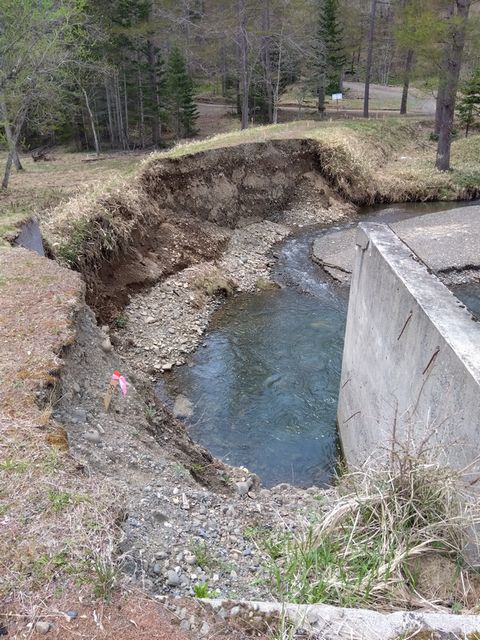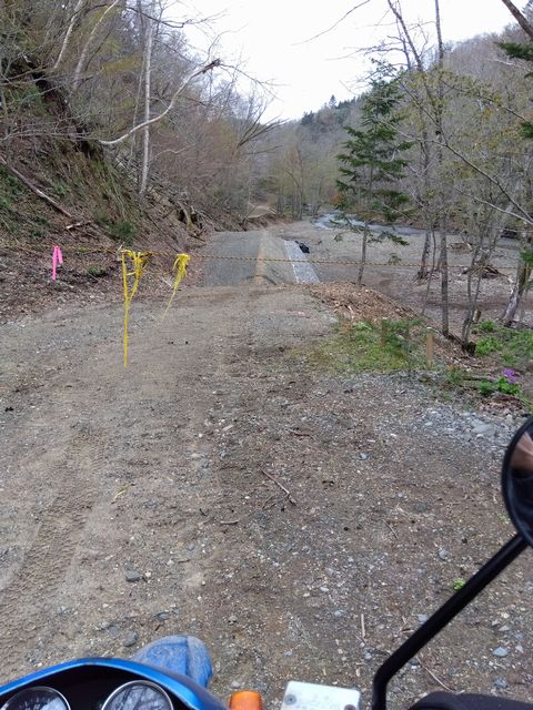 里音別林道を進むと、今度は念願の「道東大規模林道」にぶつかる。前から走りたかった林道なので、チョッと嬉しい。左へ進む。路面は落石等多く、4輪は無理め(でも1台すれ違った)。先ほど崩落で引き返した、小音別林道が左から合流。さっきの現場まで到達できれば、合わせ技で完走だと走り出すも、全然手前で草むらの中に道を見失いエンド。さらに西に進んだ大規模林道も、すぐに橋の傍が完全消失で、こちらもエンド。