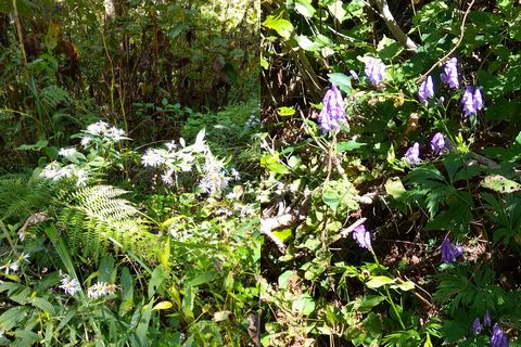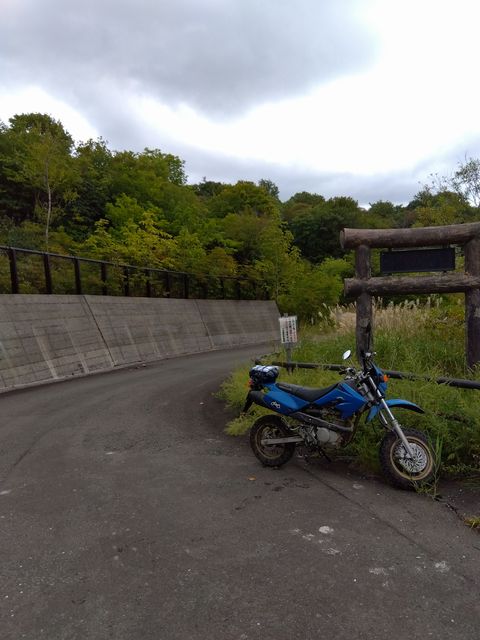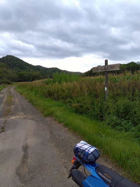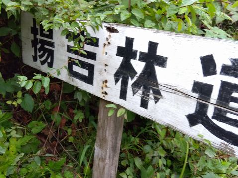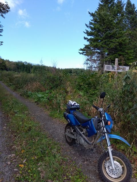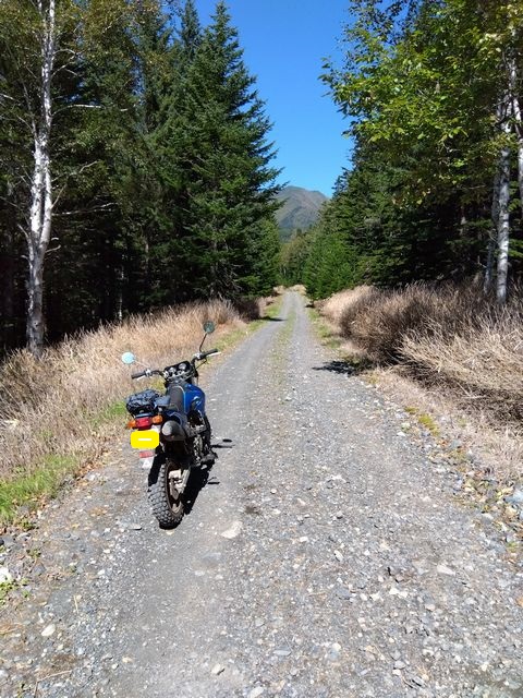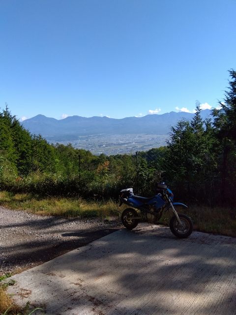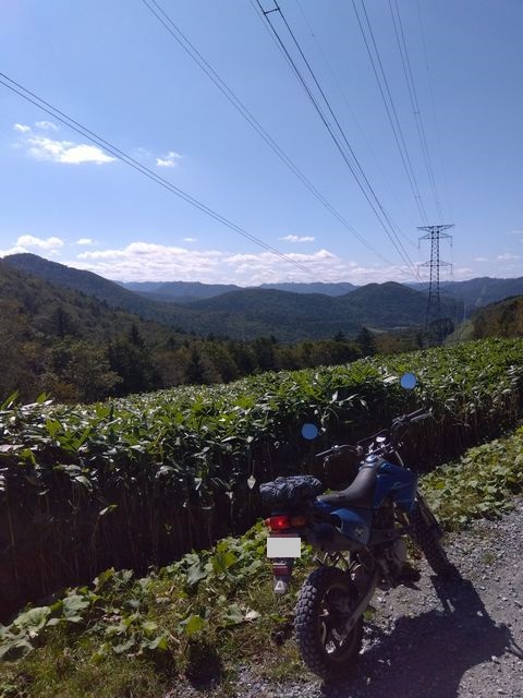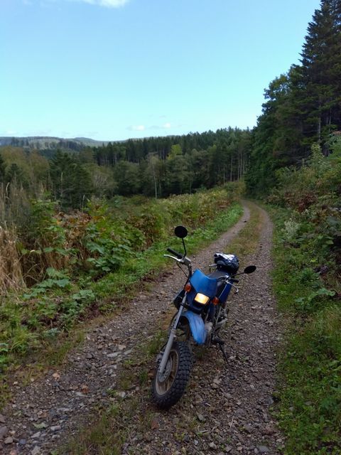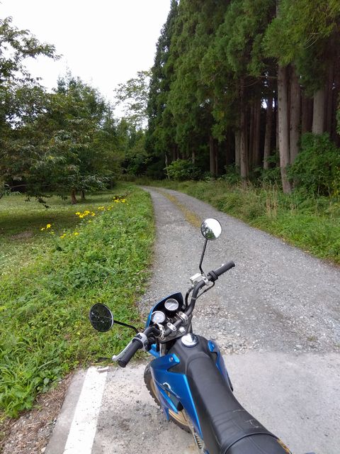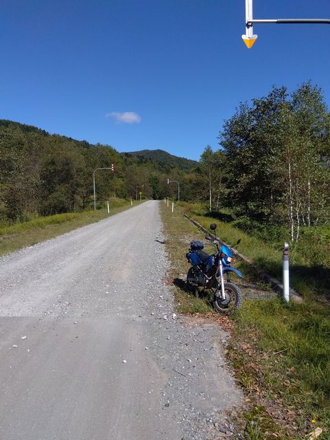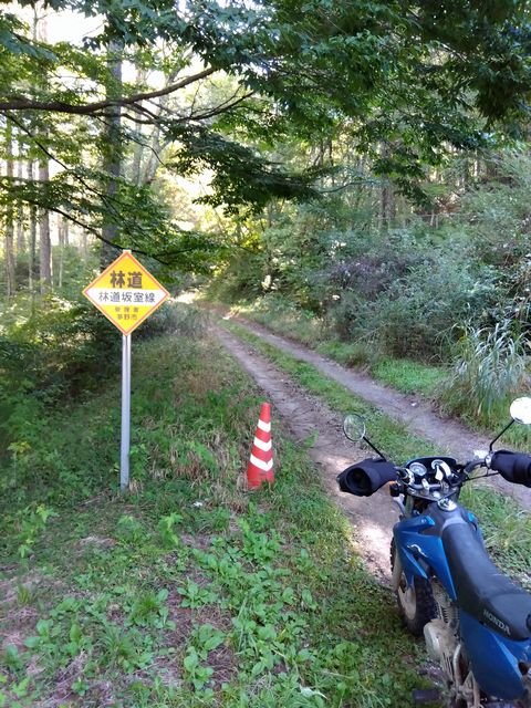 最初は野麦峠付近から南下の月夜沢林道。県道から2キロほどの橋で一応、通行止めロープあり。高い位置に緩く張ってあったので、青モトのオッサンはロープを持ち上げ下をくぐる。しばらくはここ数年で「切り出し」があったであろう、見通しの良い地域で、遠くの山々を眺めつつ進むが、左にわりと整備されつつ、ガチンコゲートの支道と分岐して、登りにかかった辺りから荒れ荒れ。下草が長くなり、落石とか小枝が隠れだし、慎重に進むが、草の勢いに負け敗退。引き返す。草の伸び切っていない、夏前とかだったらもう少し進めるかも? どっちにしても単独行は無理だ。